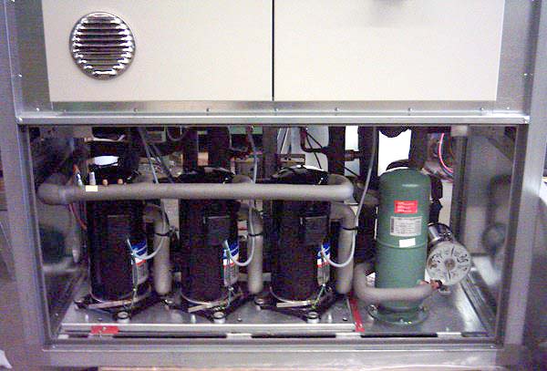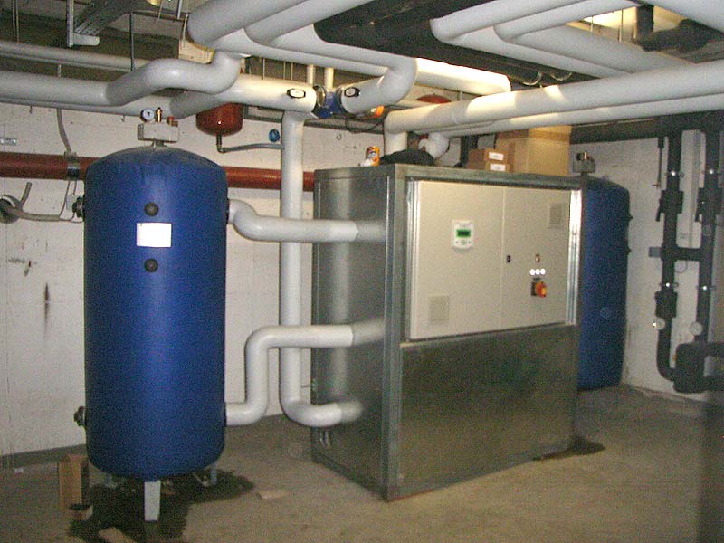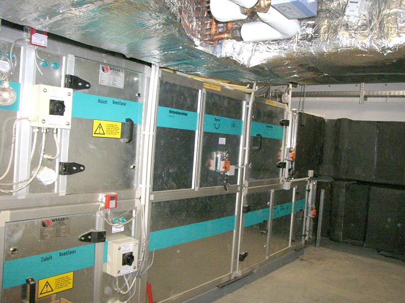 Im Zuge von Umbaumaßnahmen wurde die Filiale der Sparkasse in Pfungstadt mit einem neuen Lüftungsgerät mit einer APESS®-FF-Anlage ausgerüstet. Die APESS®-Anlage versorgt das Lüftungsgerät im Keller und die Kühldecke in der Publikumszone der Sparkasse im Sommer mit Kälte und im Winter gewinnt sie aus der Abluft des RLT-Gerätes die Wärme komplett zurück.